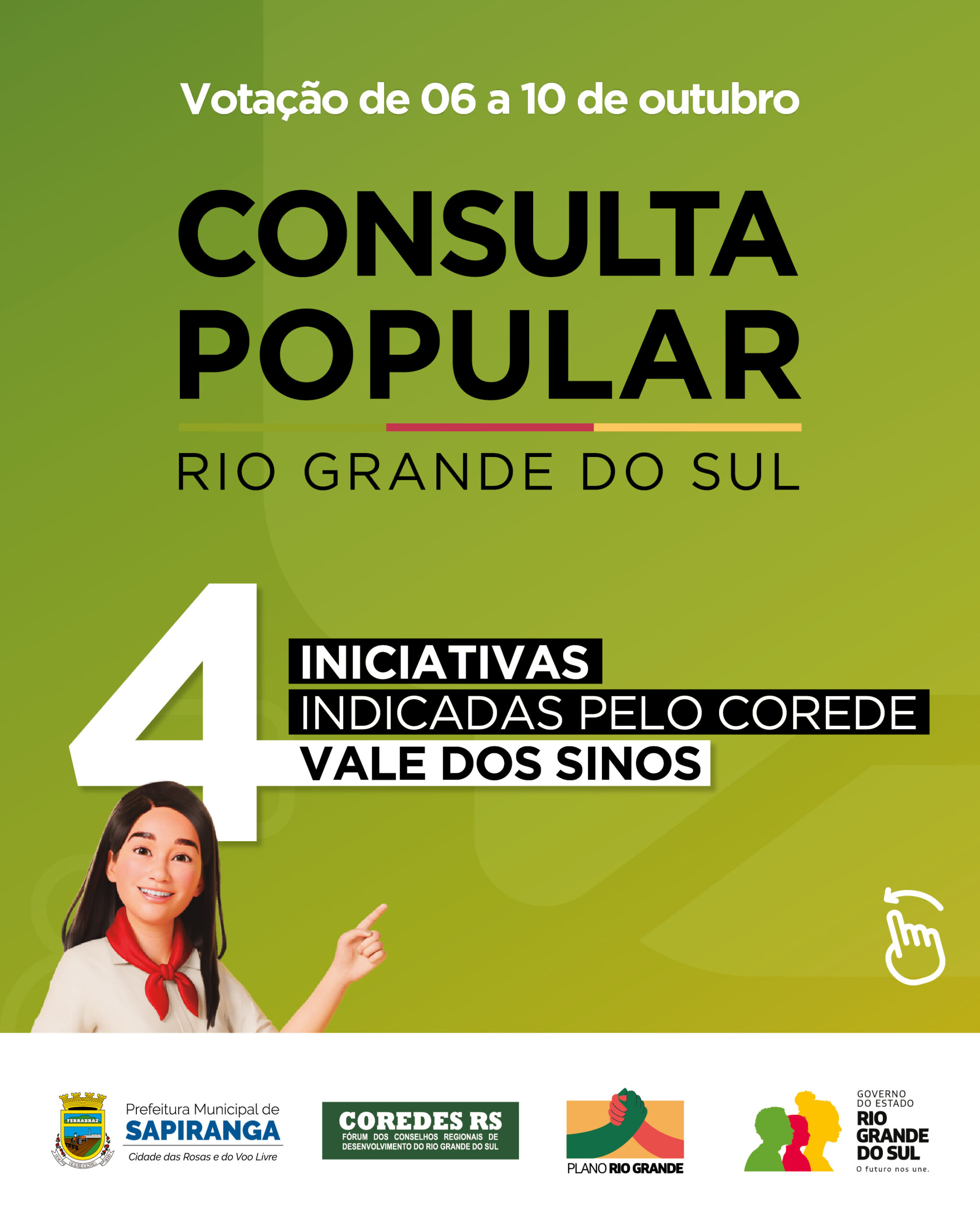 Entre os dias 6 e 10 de outubro, a população poderá participar da Consulta Popular 2025, escolhendo os projetos prioritários para o desenvolvimento do Rio Grande do Sul. A votação será realizada de forma online, pelo site oficial da Consulta Popular, e também em pontos de apoio disponibilizados pelo município.