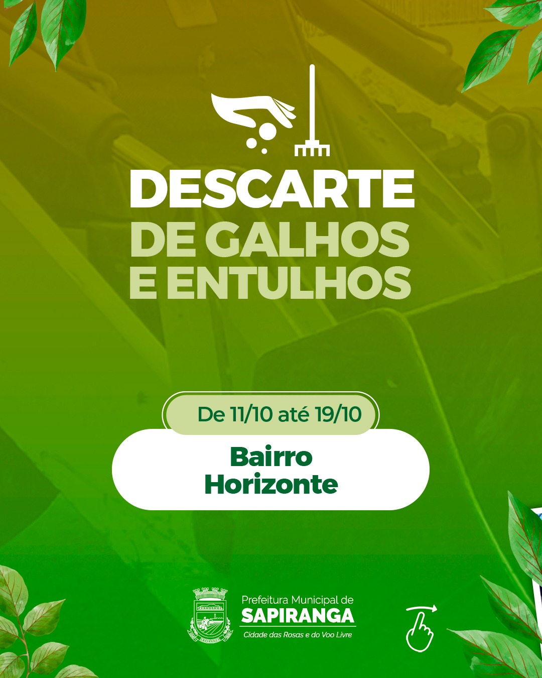 A partir deste sábado (11), os moradores do bairro Horizonte poderão realizar o descarte de galhos, folhas, móveis velhos e entulhos de obras. O material deve ser colocado em frente às residências, de forma organizada e sem bloquear a passagem de pedestres ou veículos. O período de descarte segue até o dia 19 de outubro.