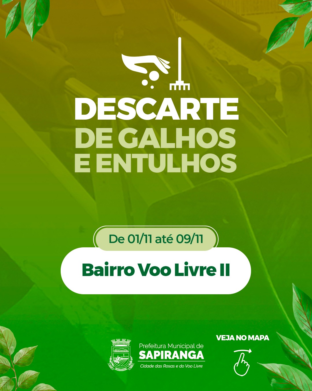 A partir deste sábado (01), os moradores do bairro Voo Livre, trecho II, poderão realizar o descarte de resíduos como galhos, folhas, móveis usados e entulhos de obras. O material deve ser deixado em frente às residências, de forma organizada e sem obstruir a passagem de pedestres ou veículos.