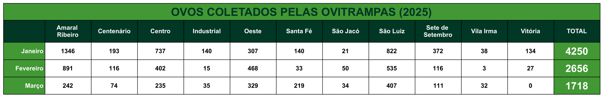 O município mantém um sistema de monitoramento com 100 ovitrampas instaladas estrategicamente em todos os bairros. Essas armadilhas, que simulam criadouros ideais para o mosquito, são recolhidas após cinco dias para análise. Os dados mostram uma redução significativa na quantidade de ovos coletados: enquanto em janeiro foram registrados 4.250 ovos, em fevereiro esse número caiu para 2.656 e, em março, chegou a 1.718 – com um Índice de Positividade de Ovitrampas (IPO) de 72%.
