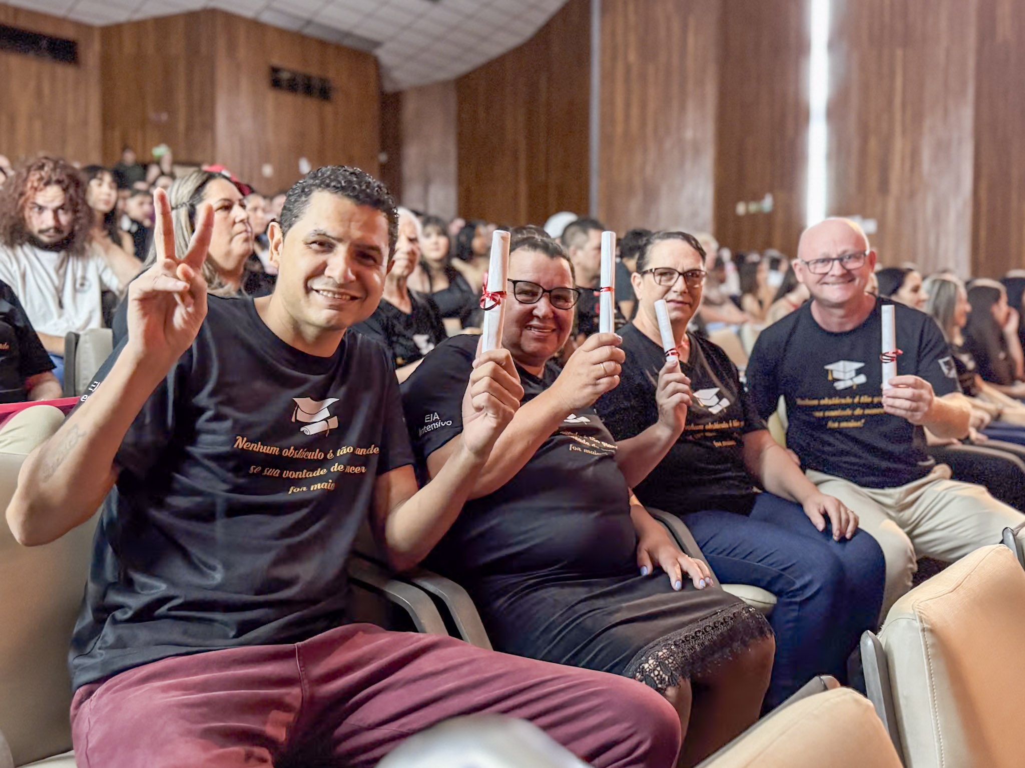 Já o EJA Reconstruir busca reintegrar o estudante ao ambiente escolar e potencializar diferentes saberes, considerando as singularidades e desafios de cada aluno. A proposta é promover a construção da cidadania por meio da socialização e da participação em atividades econômicas, políticas e culturais, com foco na equidade e na formação integral. Receberam certificação 16 alunos da Emeb Pastor Rodolfo Saenger, além de 19 estudantes do turno da manhã e 21 do turno da tarde do CME Ayrton Senna UEB.